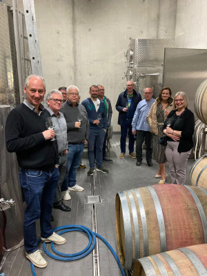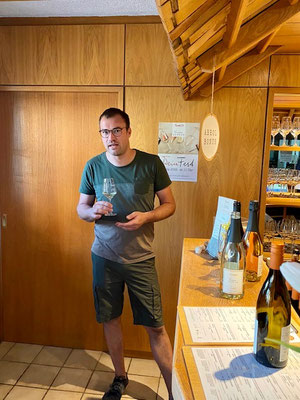 Der Jungwinzer stellte das 11 Hektar große Öko-Weingut vor, das er 2017 von seinen Eltern übernommen hat. Bereits im 17. Jahrhundert waren die Vorfahren der Waldenser-Familie Vincon aus dem Piemont nach Württemberg ausgewandert. Bei einer ausführlichen Kellerführung mit Fassproben erläuterte der Winzer seine naturnahe Betriebsphilosophie mit Handlese, Spontanvergärung und geringer Schwefelung. So entstehen in dem Ecovin-Weingut vegane und individuelle Bio-Weine.