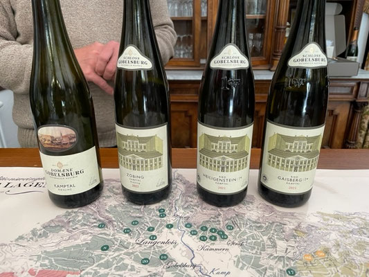 Auch bei Schloss Gobelsburg erlangt Sekt einen immer größeren Stellenwert. Wir verkosten die Schloss Gobelsburg Sekte Brut Reserve und Blanc de Blancs Brut. Für den Blanc de Blanc sprechen die wunderbaren Brioche-Noten. Beachtliche Qualität haben die im Kamptal eher untergeordneten Rotweine. Die 2018er Cuvée Bertrand aus Pinot Noir, Sankt Laurent und Zweigelt zeigt sich rund und zugänglich mit schöner Würze. Der hochwertige 2020er Schloss Gobelsburg Pinot Noir Reserve besticht durch Aromen nach Erdbeeren. Von den Süßweinen erleben wir eine schön gereifte 2017er Auslese vom Grünen Veltliner. Ausgewogene und leichte Fruchtsüße umschmeicheln den Gaumen.