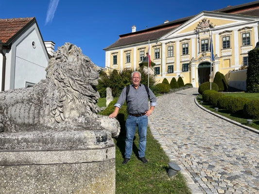 Am Schloss angekommen, fasziniert der gelbe Barockbau. Vorbei an steinernen Löwen gelangt man in den Innenhof, der an diesem sonnigen Oktober-Morgen eine wohlige Ruhe ausstrahlt. Von der direkt hinter dem Schloss laufenden Weinlese und der turbulenten Traubenverarbeitung ist nichts zu hören. Das Barock-Schloss und die Außenanlagen befinden sich in einem sehr gepflegten Zustand.